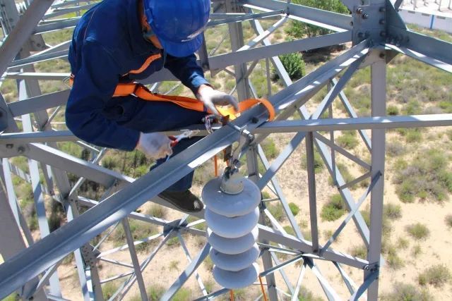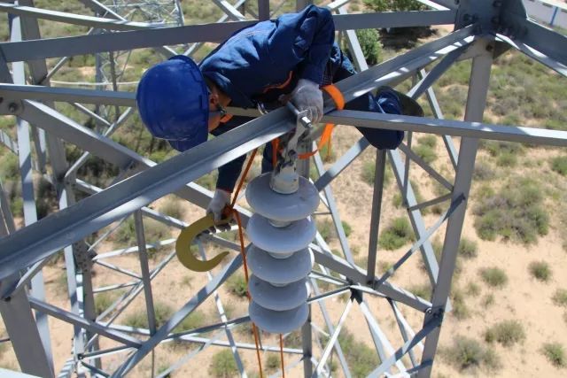 塔上作業(yè)人員用絕緣鉤掛住實(shí)驗(yàn)絕緣子